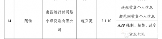 其中,在豌豆荚的“随借”APP 2.1.10版本经检测,存在违规收集个人信息,超范围收集个人信息,以及APP强制、频繁、过度索取权限的问题。