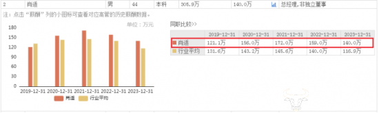 值得一提的是,根据东方财富网显示,近两年肖适的薪酬逐年下降。从2021年的172万到2022年的159万再到2023年的140万元,两年下降了32万元。