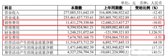 在报告期内,上汽集团的研发费用为76.75亿元,同比下降3.51%。上一年同期为79.54亿元。此外,上汽集团在上半年的销售费用为114.11亿元,虽然同比下降了10.01%,但已经超过了研发费用。