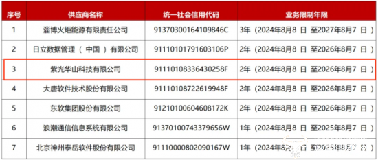 根据名单,从2024年8月8日至2026年8月7日,紫光华山科技有限公司被业务限制两年。