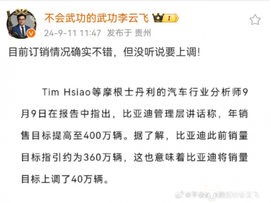 对此,李云飞也是第一时间进行了否认。9月11日,李云飞在个人社媒账号发布相关消息截图,同时表示:目前订销情况确实不错,但没听说要上调!
