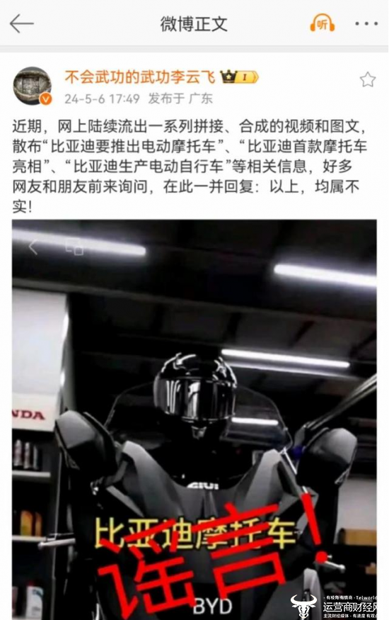 今年5月,比亚迪品牌及公关处总经理李云飞通过个人社交媒体账号发文表示:近期,网上陆续流出一系列拼接、合成的视频和图文,散布“比亚迪要推出电动摩托车”、“比亚迪首款摩托车亮相”、“比亚迪生产电动自行车”等相关信息,好多网友和朋友前来询问,在此一并回复:以上,均属不实!