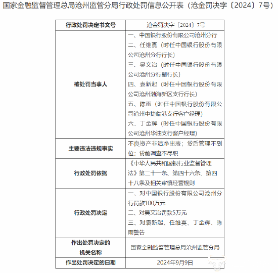 其中,时任中国银行股份有限公司沧州分行副行长的吴文治被罚款5万元。