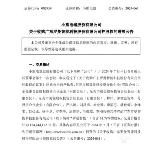 今年7月,公司董事会发布一则收购公告,称小熊电器以约1.544亿元的价格,收购罗曼智能61.78%的股权,此次是溢价109%收购了罗曼智能的股份。罗曼智能成为公司控股子公司,公司将罗曼智能纳入合并报表范围。