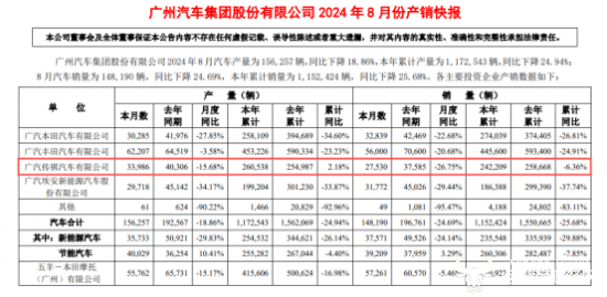 广汽集团2024年8月份产销快报显示,该月广汽传祺的销量为27530辆,与上一年同期相比下滑了26.75%,下滑幅度接近三成;今年前8个月,广汽传祺的累计销量为242209辆,与上一年同期相比,下滑了6.36%。