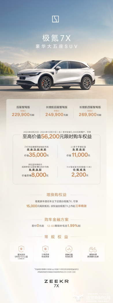 2024年9月20日到2024年10月31日(含),所有支付5000元定金的用户,可享至高价值超过5.6万元的限时购车权益,包括:价值3.5万元的ZAD完全智能驾驶辅助系统终身功能体验;可免费选配价值1.1万元的20英寸多辐轮毂;可免费选配价值至高8000元的涧石蓝外饰组合或者森野绿、云霞橙、曙光棕的外饰色;可减免2200元的7kW智能家充桩套餐(10米)。同时,极氪新车首任车主下定首台极氪7X,可享价值1.5万元的增换购权益,该权益自极氪7X上市起三年有效。
