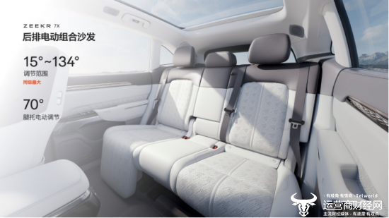 为响应用户对于二排豪华配置的需求,极氪7X提供了后排座椅套装和后排屏幕套装,用百万级的电动沙发体验,为SUV实现“豪华升舱”。在后排座椅套装内,极氪7X的后排座椅采用了与极氪009相同的NAPPA全粒面头层真皮,拥有同级唯一的电动滑轨,215mm前后滑动距离,连体式腿托,联动拥有15°~134°同级最大调节范围的靠背,带来最舒展的躺平角度,还拥有6向电动调节,通风、加热一应俱全,6种SPA级按摩模式,让身心得到极致放松。
