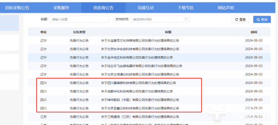 根据《供应商管理办法》的相关规定,神州数码(中国)有限公司被纳入四川移动公司“业务运营域系统(产品编码:390924002)”的负面行为供应商名单,限制该产品(服务)开展合作,限制期限为2年,自本公告发布之日起至2026年9月1日。另外,其参与该项目的应答保证金2.71万元,不予退还,且在中国移动采购与招标网对处理结果进行公告。