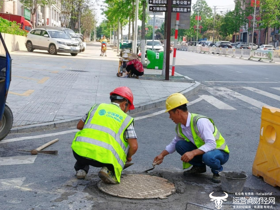 (湖北移动施工人员对通信窨井盖进行维修和更换)