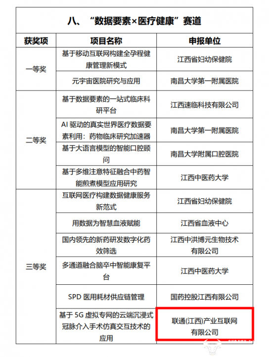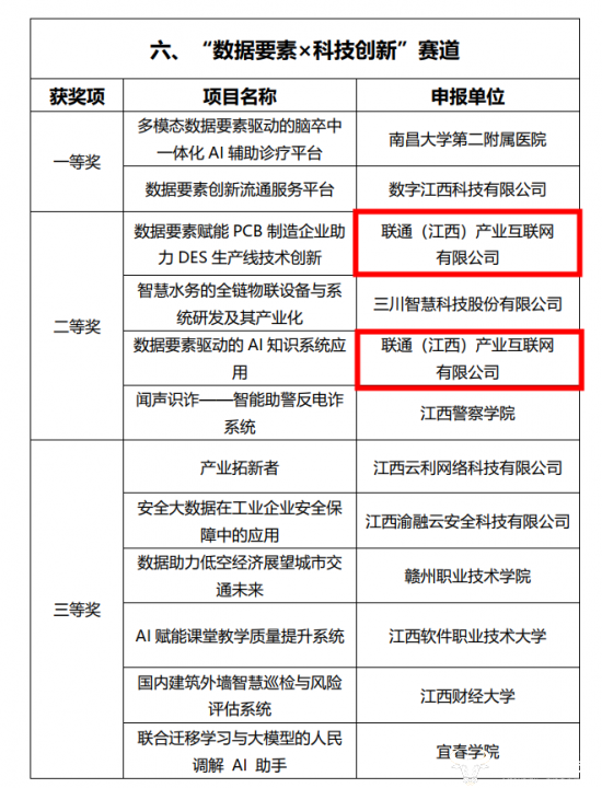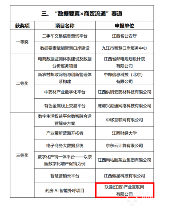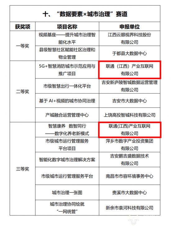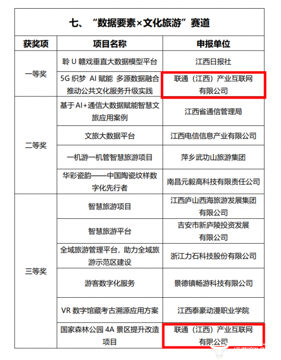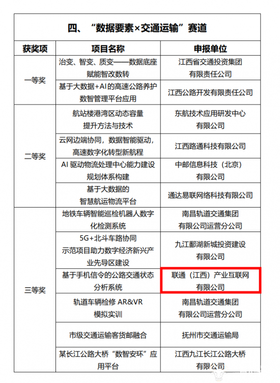 近日,2024年“数据要素×”大赛江西分赛官网公示了决赛结果,经专家组评审最终有144个项目获奖分获各赛道一、二、三等奖,入围决赛的其他参赛项目将获颁优秀奖证书。其中,江西联通共荣获23个奖项,一等奖1个、二等奖3个、三等奖7个、优秀奖12个,涵盖了文化旅游、科技创新、城市治理、商贸流通、工业制造等赛道,充分展示出江西联通近些年在数据要素领域的创新能力和应用成果,努力让数据资源“供得出、流得动、用得好”走深向实。