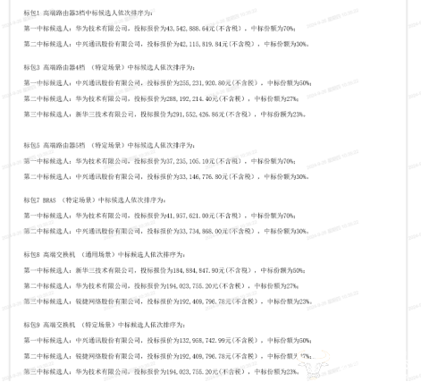 也就是说,本次采购项目总中标金额约10.99亿元。其中,华为中标份额最多,总中标金额最高;中兴紧随其后,新华三和锐捷位列第三名和第四名。