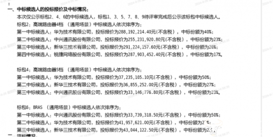 其中,华为获得9个份额,总中标金额约:4.06亿元;