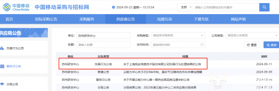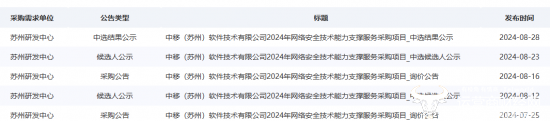 据了解,中移(苏州)软件技术有限公司发布的2024年网络安全技术能力支撑服务采购项目在2024年7月25日就发布了询价公告,项目不大,仅150万元的不含税预算。8月12日,中标候选人公布,上海观安信息技术股份有限公司拿下100%的份额。