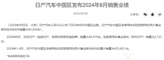 但是,日产中国发布的销量数据显示,2024年8月,东风日产(包括日产、启辰和英菲尼迪品牌)的销量为46479台。