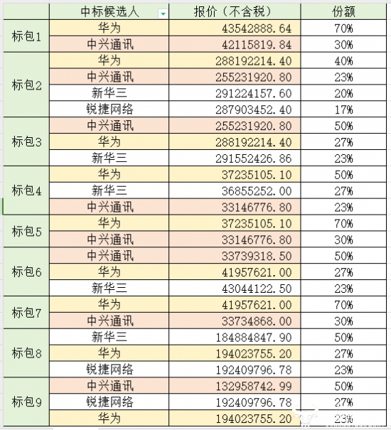 项目共有4位中选人,分别是华为、中兴通讯、新华三和锐捷网络。经过统计,华为中选9个标包,其中有5个标包都是最大份额;中兴通讯中选8个标包,拿下3个标包的最大份额,新华三中选5个标包;锐捷网络中选3个标包。