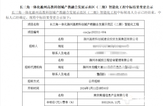 项目中标结果也发生了变更,原来排在第二中标候选人位置上的南京熊猫信息产业有限公司成为中标人。