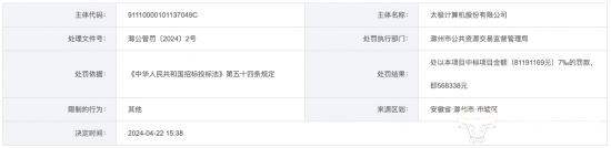 同时,太极股份被处以本项目中标项目金额(81191169元)7‰的罚款,即568338元。这个罚款金额可不小。