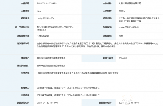 公告显示,太极股份在参加长三角一体化滁州高教科创城产教融合发展示范区(二期)智能化工程投标时,投标文件中提供的业绩“天津市大数据管理中心办公业务用房装修改造建设项目”合同协议书与事实不符,存在弄虚作假,骗取中标的情形。