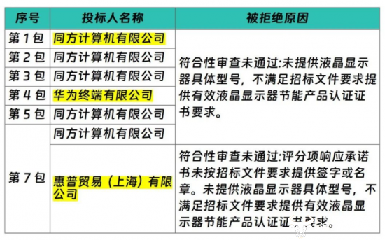 这五个标包都是一个问题,就是符合性审查没通过,具体是由于未提供液晶显示器具体型号,不满足招标文件要求提供有效液晶显示器节能产品认证证书要求。同时,华为、惠普也因为这个原因初审未通过。