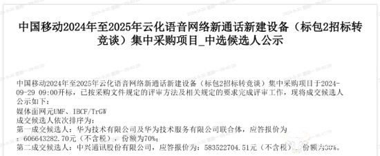 公告显示,标包2第一成交候选人仍然是华为技术有限公司及华为技术服务有限公司联合体,应答报价约6.07亿元(不含税),份额为70%;第二成交候选人是中兴通讯股份有限公司,应答报价约5.84亿元(不含税),份额为30%。