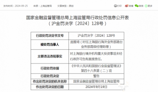 此次被处罚的是时任上海银行海外业务部港台业务部高级经理助理的庞雅琦,被处罚原因是此人对上海银行境外机构重大投资事项未经行政许可负有直接责任。
