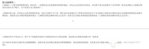 其中,有关上海银行的事件细节大致如下。上海银行委托XXX香 港管理其境外超过100亿元的自有资金,用两个XXX香 港专户分开管理。两个专户资金投资了境外美元债券及XXX香 港管理下的两只香 港公募基金。由于2021年至2022年境外美元债频频爆雷,基金表现受到重创。