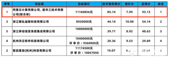 然而,项目的中选也并不只看价格,还要考虑供应商的综合水平。在技术商务上阿里云和新华三的联合体拿下了85.14的高分,远超其他公司,总得分93.13分,位列中标候选人第一名。
