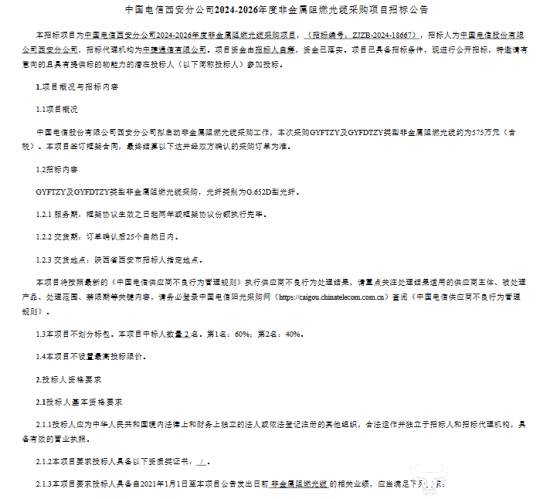 据悉,该项目不划分标包,不接受联合体投标,不接受代理商投标且不设置最高投标限价。中标人数是2名,第一名占60%份额,第二名占40%份额。要求投标人具备自2021年1月1日至本项目公告发出日前非金属阻燃光缆的相关业绩,包括:合同金额累计总额达100万元或以上;须同时提供一张发票扫描件(对应上述合同或订单(或结算单)的发票扫描件)。