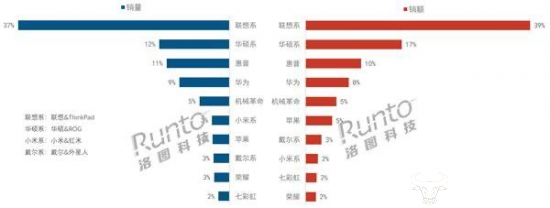 从图上可以看出,联想仍占据市场领先地位,以37%的销量份额和39%的销额份额稳居榜首。华硕和惠普分别位列第二、第三。而戴尔的销量份额已经下滑至第八位。但这个数据是否准确,还不清楚,戴尔也未就此事发布任何说法。