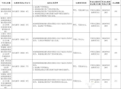 另外,时任该行零售存款部业务规划实施室经理陈某宏被罚5万;时任小微企业金融部总经理助理的王某东被罚1.75万;时任法律合规部总经理的李某峰被罚3万;时任法律合规部反洗钱室经理的易某被罚10万;时任小微企业金融部系统管理室副经理的刘某海被罚5万。