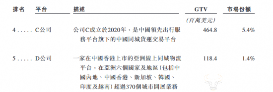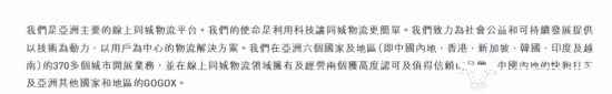 同时,货拉拉列举了四家公司上半年的GTV及市场份额,市场份额分别为A公司9.0%、B公司7.3%、C公司5.4%,D公司则为1.4%。所谓的D公司,即一家在中国香 港上市的亚洲线上同城物流平台,在亚洲六个国家及地区超过370个城市开展业务。显然,这家公司指的是与货拉拉较为相似的快狗打车。因为快狗打车的资料介绍中称,其在亚洲六个国家级地区(即中国内地、香 港、新加坡、韩国、印度及越南)的370多个城市开展业务。