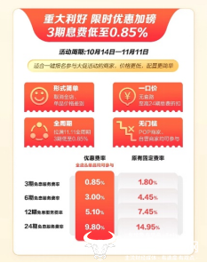 商家将明确享受到,今年京东11.11期间,京东白条息费优惠周期长、价格低、力度大。商家报名即可享受3期低至0.85%的超低息费。所有息费均全面降至历史低价,优惠不分全店或单品,全部一口价, 确保商家享受到实实在在的优惠。