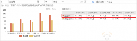 根据东方财富网显示,赵超峰去年的薪酬为142.5万,比上一年低了15.2万。奇怪的是,去年赵超峰还升职了,从财务总监变成副总经理兼财务总监,身兼两职,但是薪酬怎么反倒降低了。