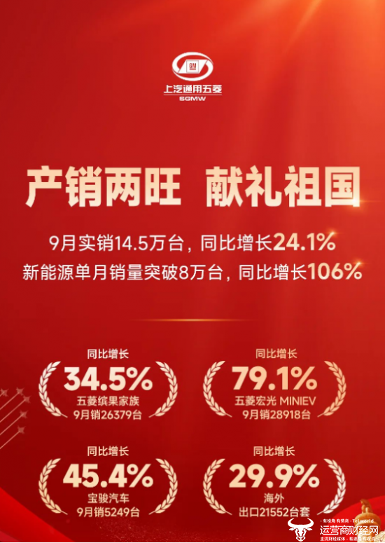 上汽通用五菱官方公众号公布的产销数据显示,9月份公司实销汽车14.5万台,同比增长24.1%,其中新能源单月销量突破8万台,同比增长106%。今年前9个月,上汽通用五菱的新能源累计销量已经突破了40万台,销量表现亮眼。