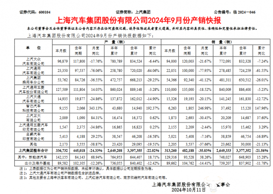 官方数据显示,上汽集团2024年9月销售汽车313260辆,同比下降35.03%;比亚迪2024年9月销售汽车419426辆,同比增长45.91%。