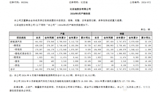 9月,比亚迪实现产量441052辆;1月-9月公司累计实现产量2760910辆,同比增长30.68%。