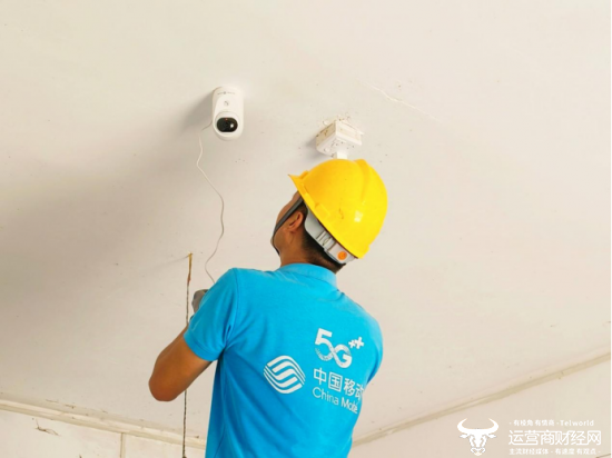 (湖北移动技术人员在学校走廊安装高清摄像头)