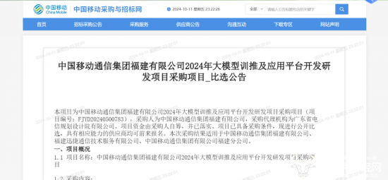 2024 年9月13日,中国移动通信集团福建有限公司发布《2024 年大模型训推及应用平台开发研发项目》比选公告,预算金额为1238.04 万元。