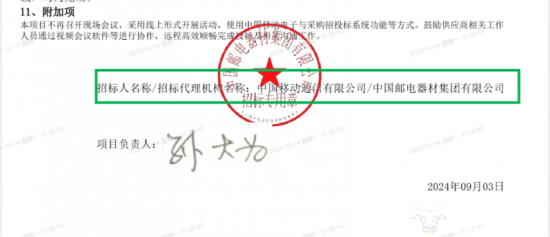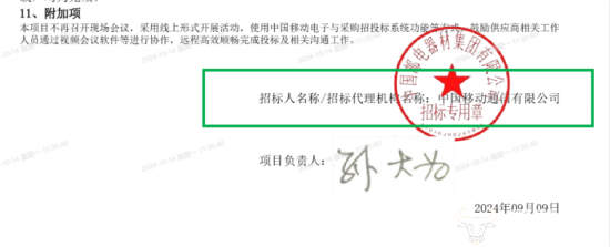 除了时间方面的不同外,两次招标仅文末落款处招标代理机构名称不同,由“中国邮电器材集团有限公司”变成了“中国移动通信有限公司”。