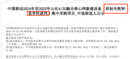 在重新招标一个月后,中国移动于10月10日发布该项目中选候选人,同时表示因招标失败转竞争性谈判。