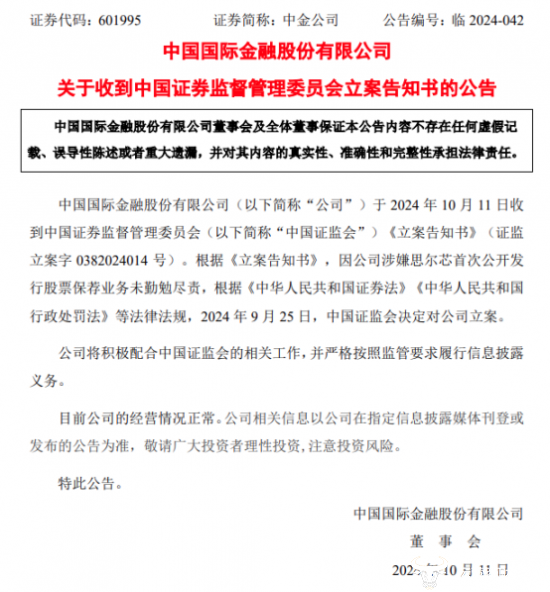 中国国际金融股份有限公司于10月11日,在上海证券交易所发布公告显示,其收到了中国证券监督管理委员会的《立案告知书》。具体内容为,中金公司于9月25日被中国证监会立案,原因是公司涉嫌思尔芯首次公开发行股票保荐业务未勤勉尽责。