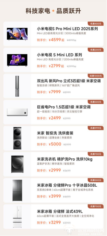 科技家电,款款特惠。根据小米公司发布的2024年Q2财报,截至2024年第二季度,小米AIoT平台已连接的IoT设备数达到8.22亿台,同时拥有5件及以上设备连接至AIoT平台的用户数达到1610万,是全球最大的消费级IoT平台之一。这个双11期间,小米电视、空调、冰箱、洗衣机等大家电,净化器、净水器、扫地机器人等智能家居,以及可穿戴等AIoT全品类也将全线让利,提供数百款爆品特惠。小米电视S Pro Mini LED 2025系列新品优惠400元,到手价4599元起,米家空调双出风Pro立式3匹超1级优惠达到1000元,米家智投洗洗烘套装也可以立省999元。此外,消费者还能够参与以旧换新补贴,可以说是补贴之上再加补贴。以北京地区用户为例,消费者可通过小米商城或指定小米之家门店,同时参与以旧换新政府补贴和小米双11大促活动。比如购买米家冰箱分储鲜Pro十字冰晶508L,划线价4499元,双11大促直接优惠500元之后售价3999元,还可以继续享受依旧换新补贴。