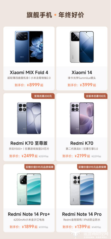 旗舰手机,年终好价。本次双11期间,包括新一代折叠屏旗舰机小米MIX Fold 4 、历时三年打造的小米首款小折叠小米MIX Flip,以及小米14、Redmi K70至尊版、Redmi K70、Redmi Note 14 Pro系列等众多爆款机型,覆盖众多不同价位段,均将现货开卖,消费者无需等待即可提前享受惊喜优惠。其中,Redmi K70至尊版至高优惠200元,Redmi K70全版本优惠100元到手价2199元起。日前最新发布的Redmi Note 14 Pro系列,全新升级Redmi金刚架构,更加坚固耐摔,首销刷新2024年安卓全价位段首销周冠军。现在购买,还可获赠价值595元的品质保障福利,一年碎屏保、一年电池盖保、五年电池保,还有一年进水保。强悍小金刚,保护之上再加一层保障,性价比拉满。