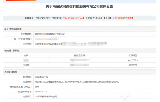 因为上述违规行为,9月30日,某系统采购网将南京欣网通信列入采购暂停名单,决定自2024年09月30日起暂停其参加一定范围采购活动资格。