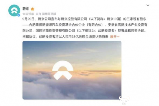 9月29日,蔚来官宣再获33亿融资。官方称,蔚来公司与蔚来控股有限公司的三家现有股东——合肥建恒新能源投资基金合伙企业(有限合伙)、安徽省高新技术产业投资有限公司、国投招商投资管理有限公司签署战略投资协议。根据协议,战略投资者(指上述公司)以人民币33亿元现金增资认购蔚来。