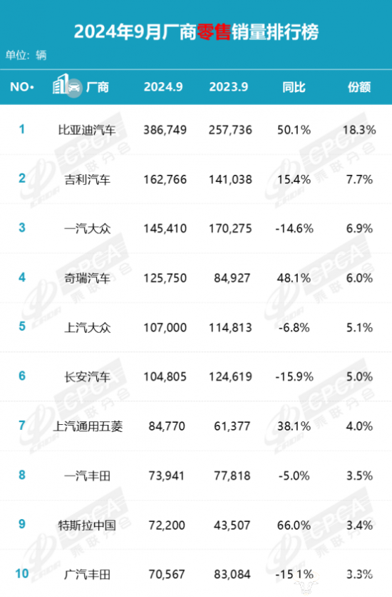 在2024年9月厂商零售销量排行榜中,排在第一位的依旧是比亚迪汽车,其在9月的销量为386749辆,较去年同期增长50.1%,所占的市场份额也最高,为18.3%;