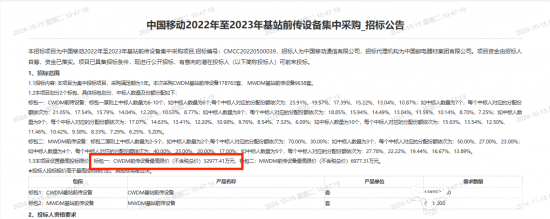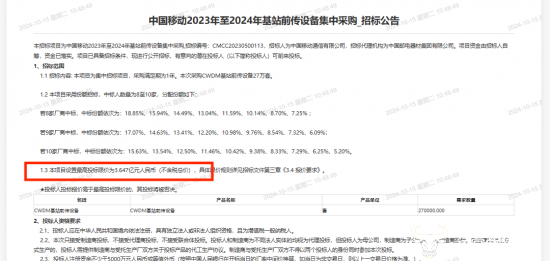2022年,中国移动曾采购178763套CWDM基站前传设备,该标包最高投标限价约3.30亿元(不含税),最高单价约1844.76万元(不含税)。