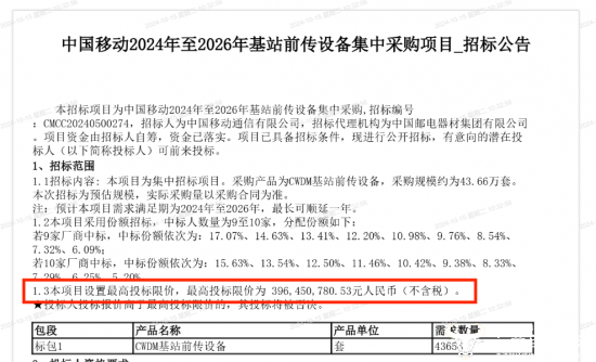 10月9日,中国移动发布“2024年至2026年基站前传设备集中采购项目”招标公告。采购产品是436567套CWDM基站前传设备,最高投标现价约3.96亿元(不含税)。也就是说其最高单价约908.11万元(不含税)。
