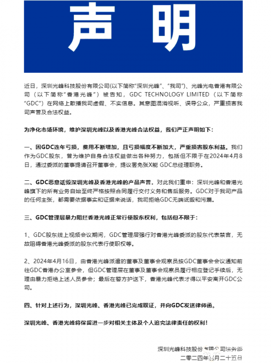 同时,光峰科技还表示GDC方面曾散布“虚假信息,恶意诋毁”,存在“GDC管理层曾暴力阻拦香 港光峰正常行使权力:禁言股东代表、暴力拒绝股东参会,警察护送才能安全离开”等行为,听起来有些骇人听闻,对此言论,GDC方面并未回应,到底是不是真的?