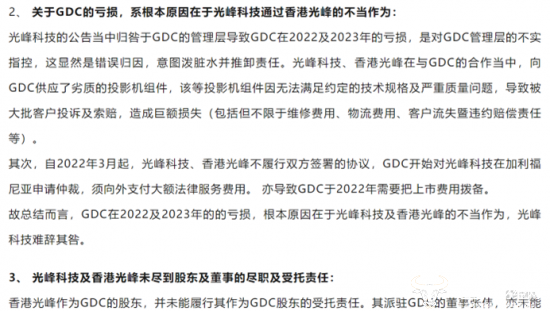 一周后,GDC回应称:“GDC的亏损,系根本原因在于光峰科技通过香 港光峰的不当作为”、“光峰科技、香 港光峰在与GDC的合作当中,向GDC供应了劣质的投影机组件,造成巨额损失。”